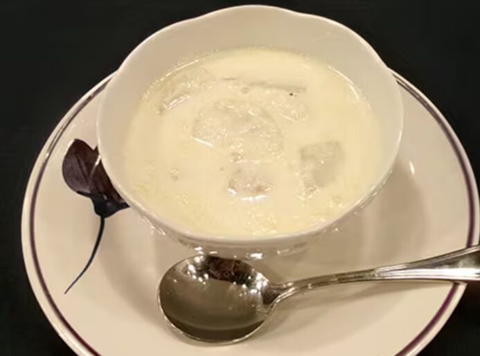 そこにスープを入れて煮込み、最後に牛乳と生クリームを加えますが、ここでポイントなのがすりおろした里芋。
